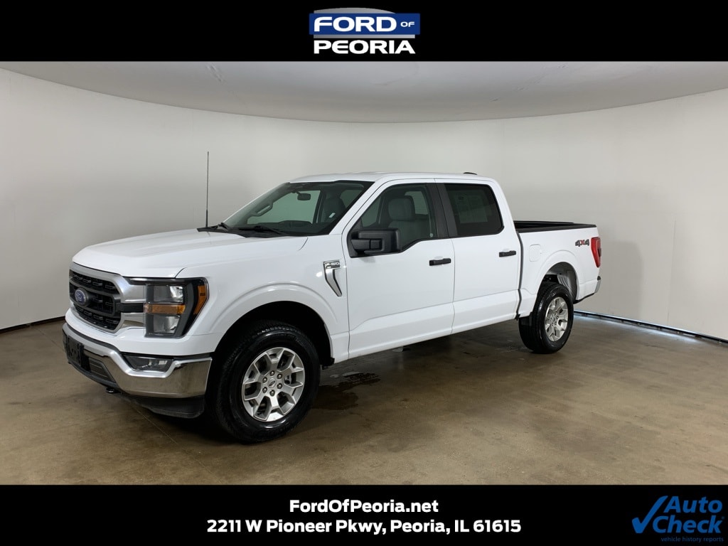 Oxford White 2023 Ford F-150 XLT 4x4 SuperCrew with Black/Medium Dark Slate cloth interior - available now at Ford of Peoria in Peoria, IL. This clean AutoCheck one-owner truck combines EcoBoost power, advanced technology, and everyday versatility, making it an ideal choice for work, play, or daily driving.