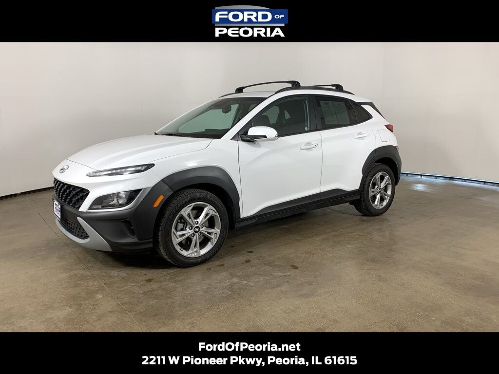 Lunar White 2023 Hyundai Kona SEL AWD with Black interior - available now at Peoria Toyota in Peoria, IL. This clean AutoCheck one-owner Hyundai Kona SEL offers a smart blend of all-wheel-drive capability, excellent fuel efficiency, and modern technology in a compact SUV that's easy to drive and easy to own. Perfect for commuting, city driving, or weekend getaways, the Kona delivers versatility without sacrificing comfort.