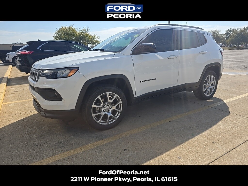 Clean CARFAX. CARFAX One-Owner. 4WD, 3.73 Axle Ratio, 4-Wheel Disc Brakes, 6 Speakers, ABS brakes, Air Conditioning, Alloy wheels, AM/FM radio: SiriusXM, Anti-whiplash front head restraints, Auto High-beam Headlights, Auto-dimming Rear-View mirror, Brake assist, Bumpers: body-color, Compass, Delay-off headlights, Driver door bin, Driver vanity mirror, Dual front impact airbags, Dual front side impact airbags, Electronic Stability Control, Emergency communication system: SiriusXM Guardian, Four wheel independent suspension, Front anti-roll bar, Front Bucket Seats, Front Center Armrest w/Storage, Front fog lights, Front License Plate Bracket, Front reading lights, Fully automatic headlights, Heated door mirrors, Heated front seats, Heated steering wheel, Illuminated entry, Knee airbag, Leather Shift Knob, Leather Trimmed Bucket Seats, Low tire pressure warning, Occupant sensing airbag, Outside temperature display, Overhead airbag, Overhead console, Panic alarm, ParkView Rear Back-Up Camera, Passenger door bin, Passenger vanity mirror, Power door mirrors, Power driver seat, Power steering, Power windows, Quick Order Package 2GL, Radio: Uconnect 5 w/10.1" Display, Rear anti-roll bar, Rear seat center armrest, Rear window defroster, Rear window wiper, Remote keyless entry, Roof rack: rails only, Security system, Speed control, Split folding rear seat, Spoiler, Steering wheel mounted audio controls, Tachometer, Telescoping steering wheel, Tilt steering wheel, Traction control, Trip computer, Variably intermittent wipers, Wheels: 18" x 7.0" Painted Aluminum. Recent Arrival! 2022 Jeep Compass Latitude Lux Bright White Clearcoat